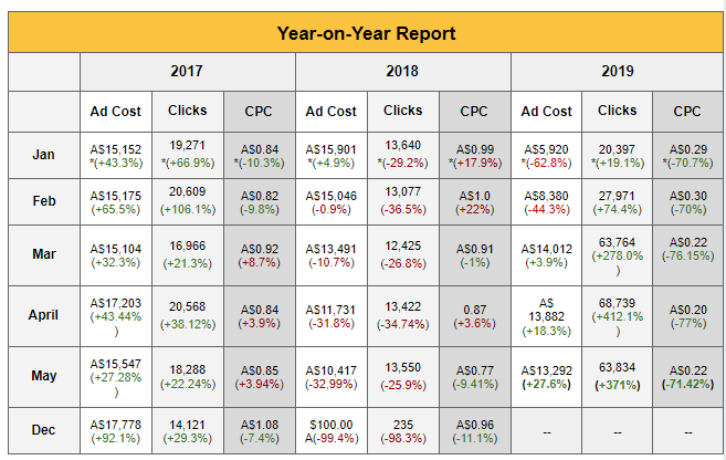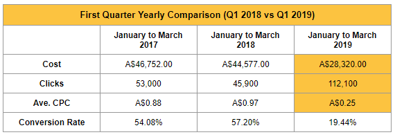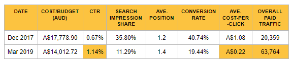 The average cost-per-click also dropped from A$1.08 to A$0.22—the lowest historical CPC recorded for the client. These figures show that the client received almost 80% more traffic in March 2019 compared to when it spent the most in Google advertising.