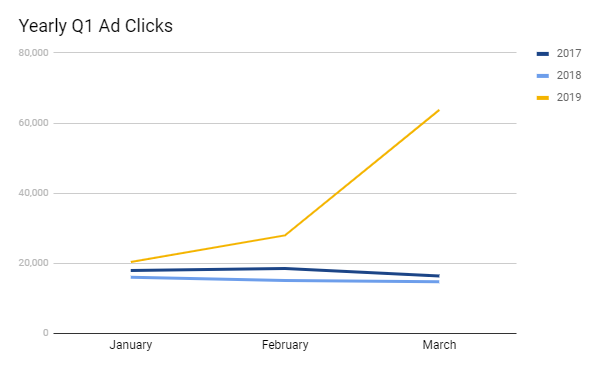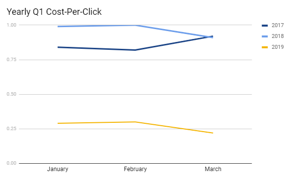 Although the paid traffic was better in some months of 2017, it wasn’t sustained the following year. In fact, overall yearly paid traffic in 2018 decreased by 54.4%. The average PPC budget for 2018 was around $11,838. Ad cost was reduced in January and February 2019 mainly because the budget allocation was relatively smaller. Nevertheless, these months still outperformed the previous years’ performances in terms of traffic acquisition and cost-per-click.