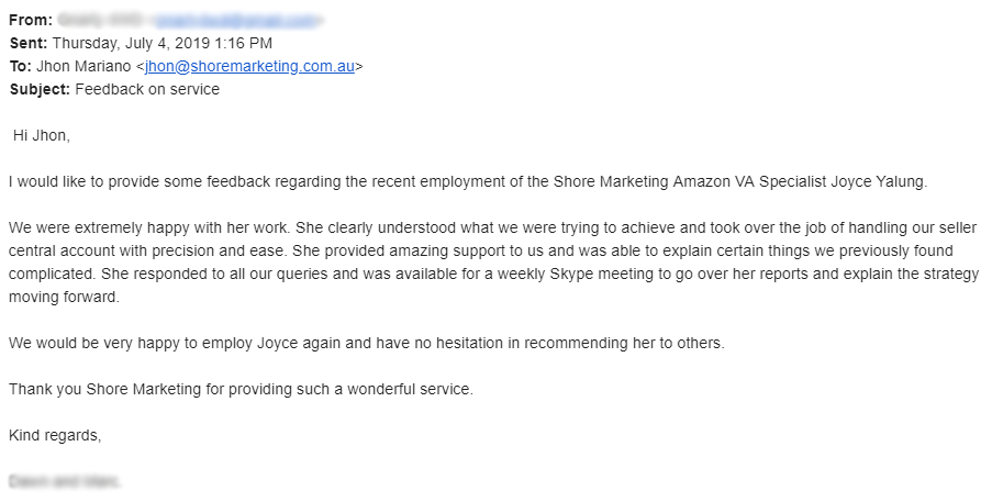 Pleased with Shore360 Agency’s service, the client, without prompting, left some kind words for us: