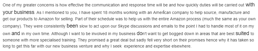 For 18 months, the client worked with an American company only to find that their business needs were still not being met. Apparently, the company was “consistently slow to act upon [their] Skype discussions and emails” to the point that the client was left to deal with most of the work. It also didn’t understand that the client, being a new seller on Amazon, does not really have a background in e-commerce jargons and technicalities.