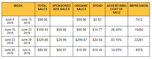 Sponsored ads started contributing to overall sales as well. For example, between June 16 and June 22, sponsored ads delivered 37% of the client’s total sales. Meanwhile, in the first week of July, 77% of overall sales came from paid ads.